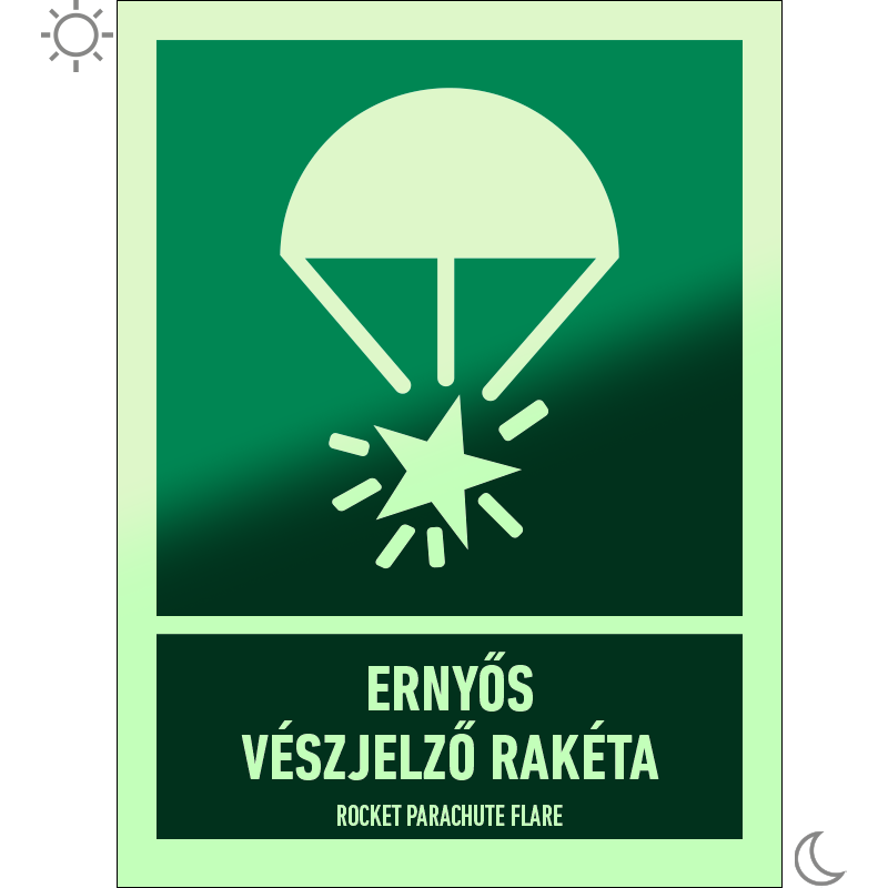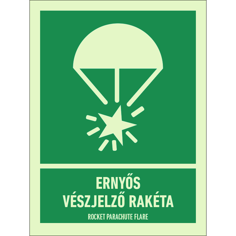 Az “Ernyős vészjelző rakéta” a hajón található ernyős vészjelző rakéta helyét mutató zöld alapon fehér piktogram.