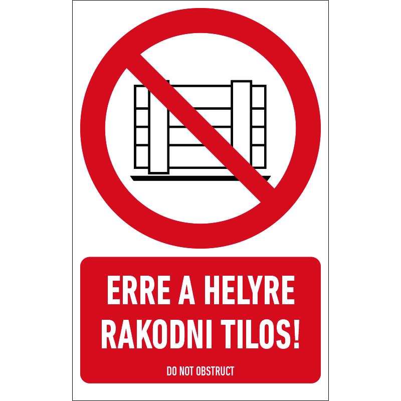 Az “Erre a helyre rakodni tilos!” a közlekedőút vagy kijárat eltorlaszolását tiltó piktogram+felirat.