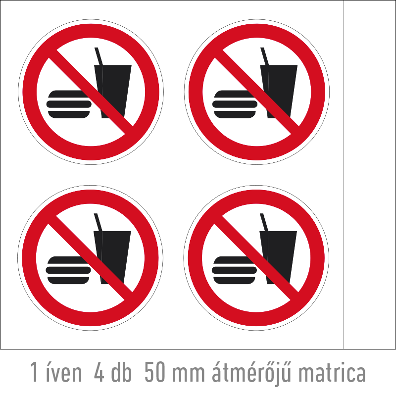 | Étkezni, inni tilos! matrica (ISO 7010-P022 piktogram) 50 mm TIT030000ONV00500000 | vinil öntapadó | 50 mm | 50 mm | 0.2 mm | ív | 330 Ft | 419 Ft |