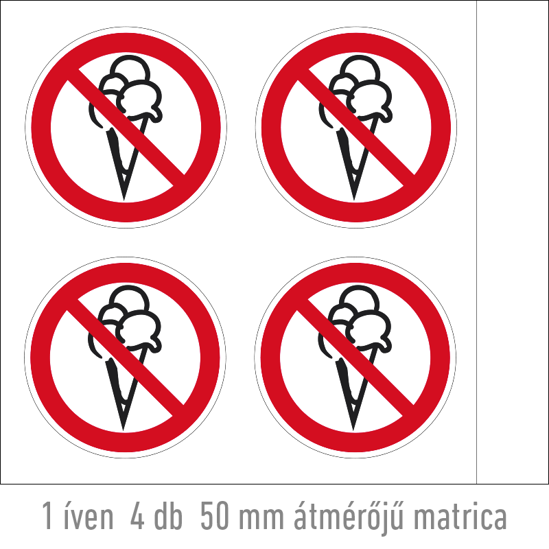 | Fagylalttal belépni tilos! matrica (piktogram) (belülről ragasztható) 50 mm TIT033002ONV00500000 | vinil öntapadó | 50 mm | 50 mm | 0.2 mm | ív | 495 Ft | 629 Ft |