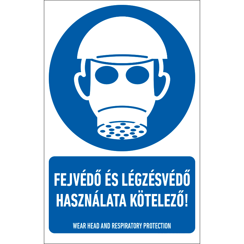 A “Fejvédő és légzésvédő használata kötelező!” az egészség védelmére vonatkozik: munkavédelmi fejvédő és légzésvédő használatát előíró kék alapon fehér piktogram+felirat.