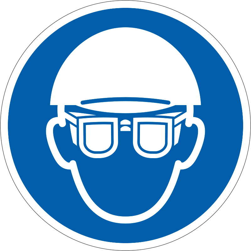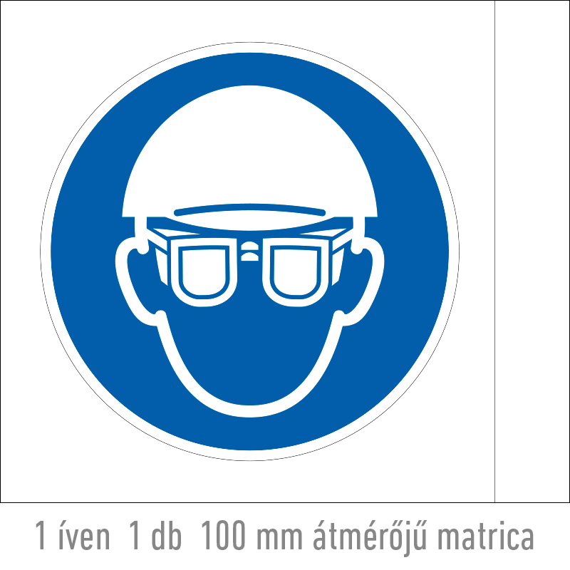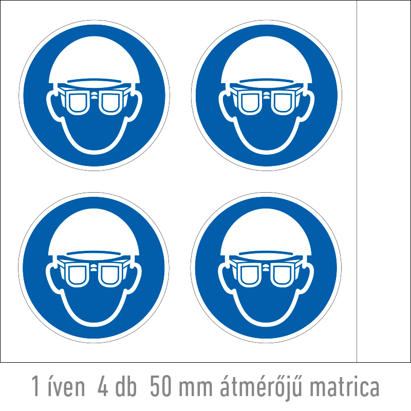 A “Fejvédő és védőszemüveg használata kötelező!” a fej védelmére vonatkozik: munkavédelmi fejvédő és védőszemüveg használatát előíró kék alapon fehér piktogram.