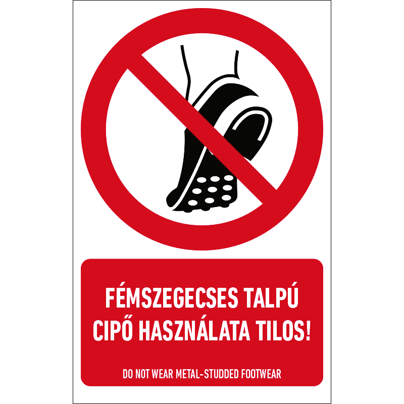 A “Fémszegecses talpú cipő használata tilos!” a fémszegecses talpú cipő használatát tiltó piktogram+felirat.