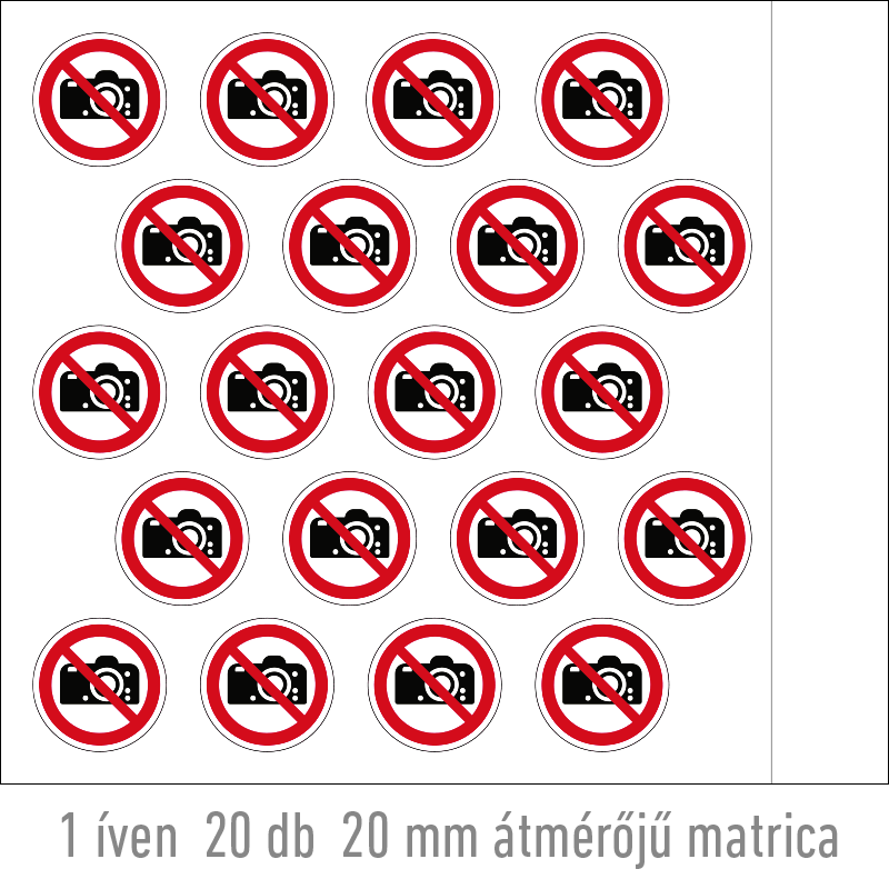 | Fényképezni tilos! matrica (ISO 7010-P029 piktogram) 20 mm TIT041000ONV00200000 | vinil öntapadó | 20 mm | 20 mm | 0.2 mm | ív | 330 Ft | 419 Ft |