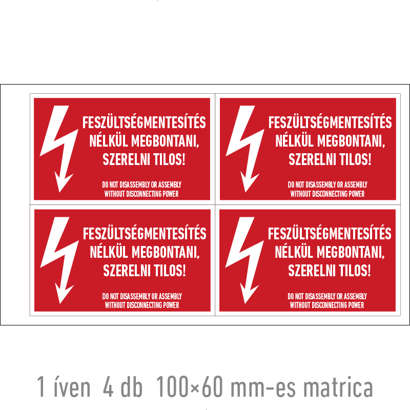 | Feszültségmentesítés nélkül megbontani, szerelni tilos! matrica 160x100 mm ERV030001ONV01600100 | vinil öntapadó | 160 mm | 100 mm | 0.2 mm | db | 330 Ft | 419 Ft |