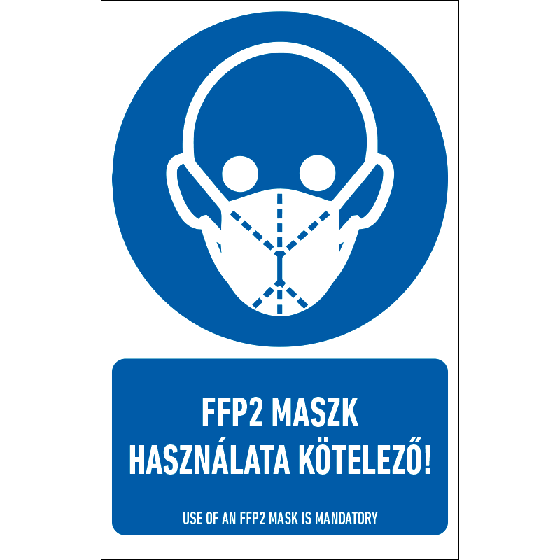 Az “FFP2 maszk használata kötelező!” a biztonság és egészség védelmére vonatkozik: az FFP2 maszk használatát előíró kék alapon fehér piktogram+felirat.