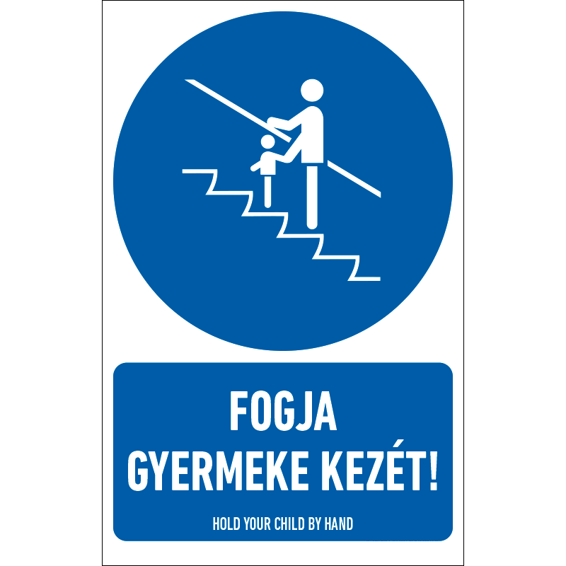 A “Fogja gyermeke kezét!” a biztonság és egészség védelmére vonatkozik: a gyermek felügyeletére figyelmeztető kék alapon fehér piktogram+felirat.