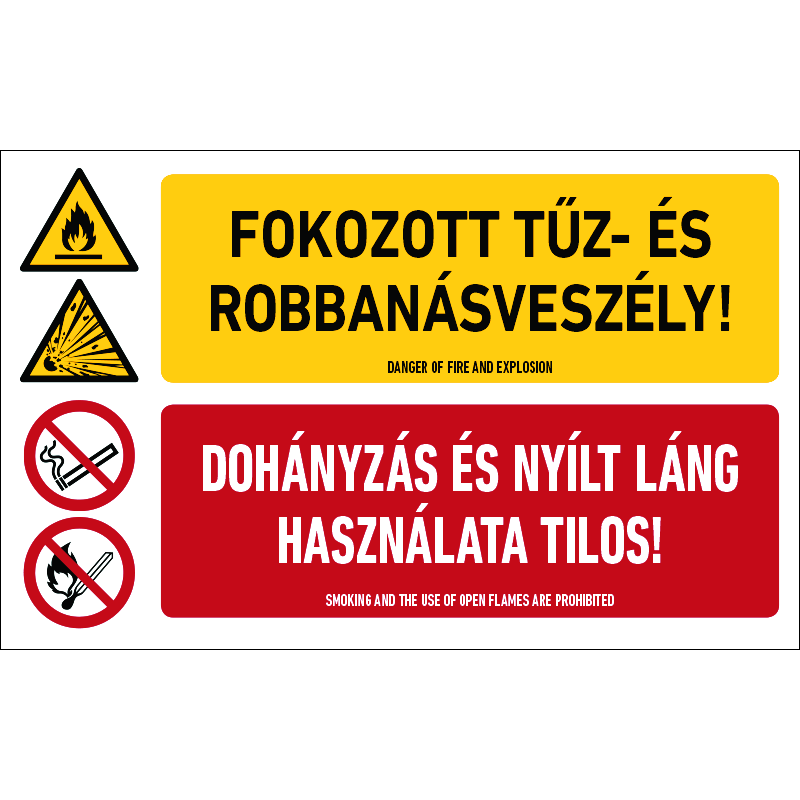 A “Fokozott tűz- és robbanásveszély! Dohányzás és nyílt láng használata tilos!” a fokozott tűz- és robbanásveszély miatt a dohányzást és nyílt láng használatát tiltó piktogram+felirat.