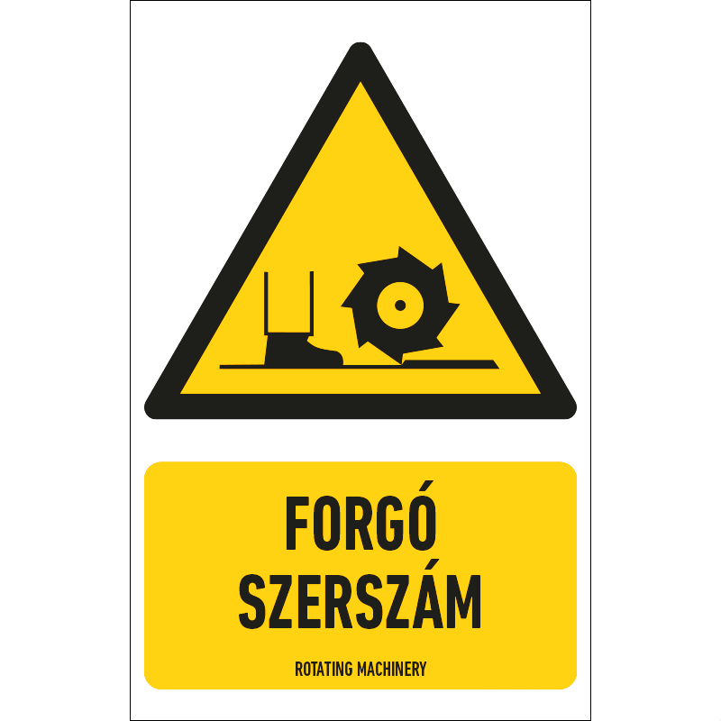 A “Forgó szerszám” a forgó alkatrészek okozta sérülésveszélyre figyelmeztető piktogram+felirat.
