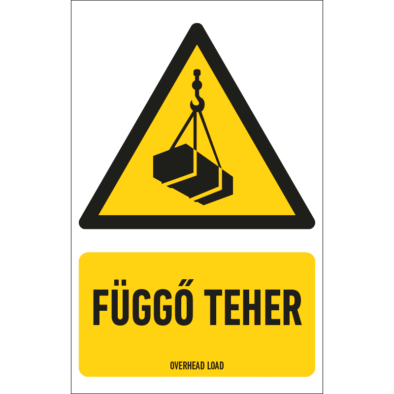 A “Függő teher” a függesztve mozgatott teher okozta balesetveszélyre figyelmeztető piktogram+felirat.