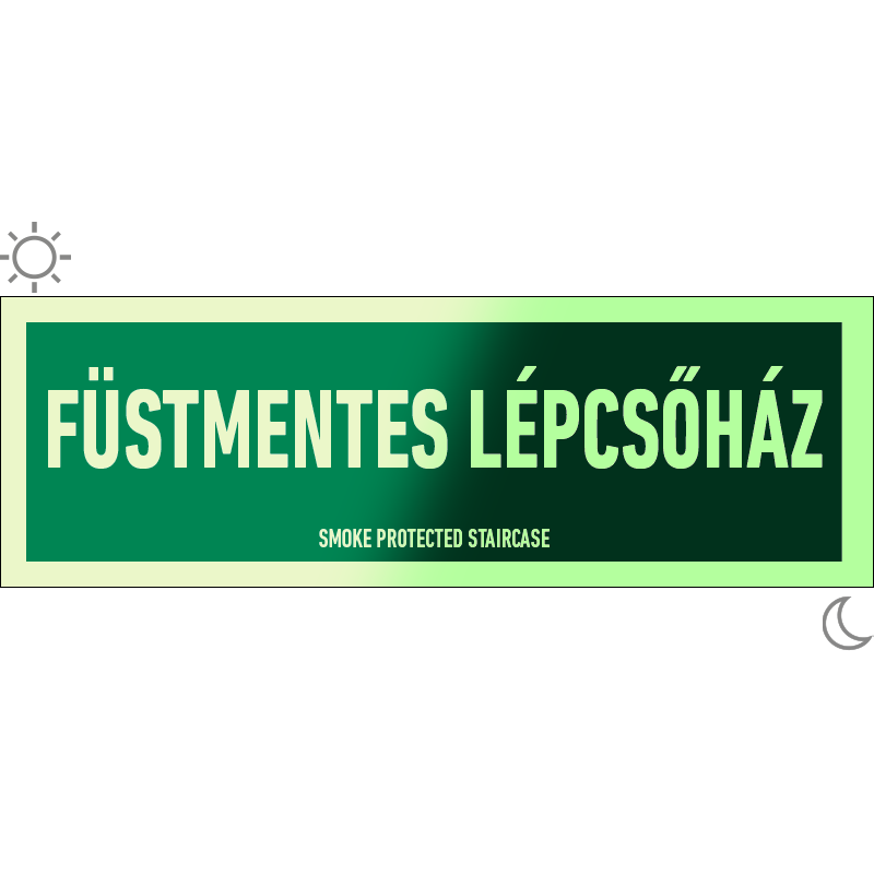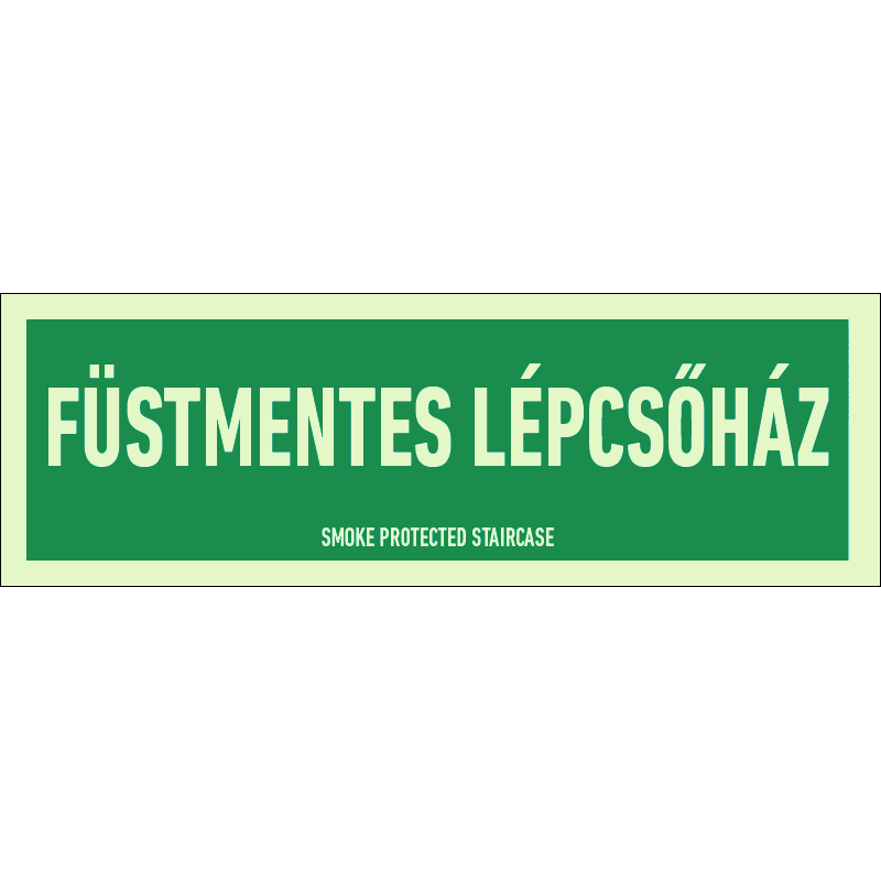 A “Füstmentes lépcsőház” az épület füstmentes lépcsőházát sötétben utánvilágítva jelző zöld alapon fehér felirat.