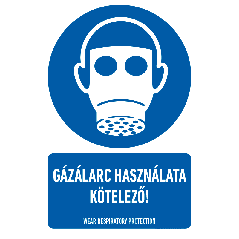A “Gázálarc használata kötelező!” az egészség védelmére vonatkozik: gázálarc használatát előíró kék alapon fehér piktogram+felirat.