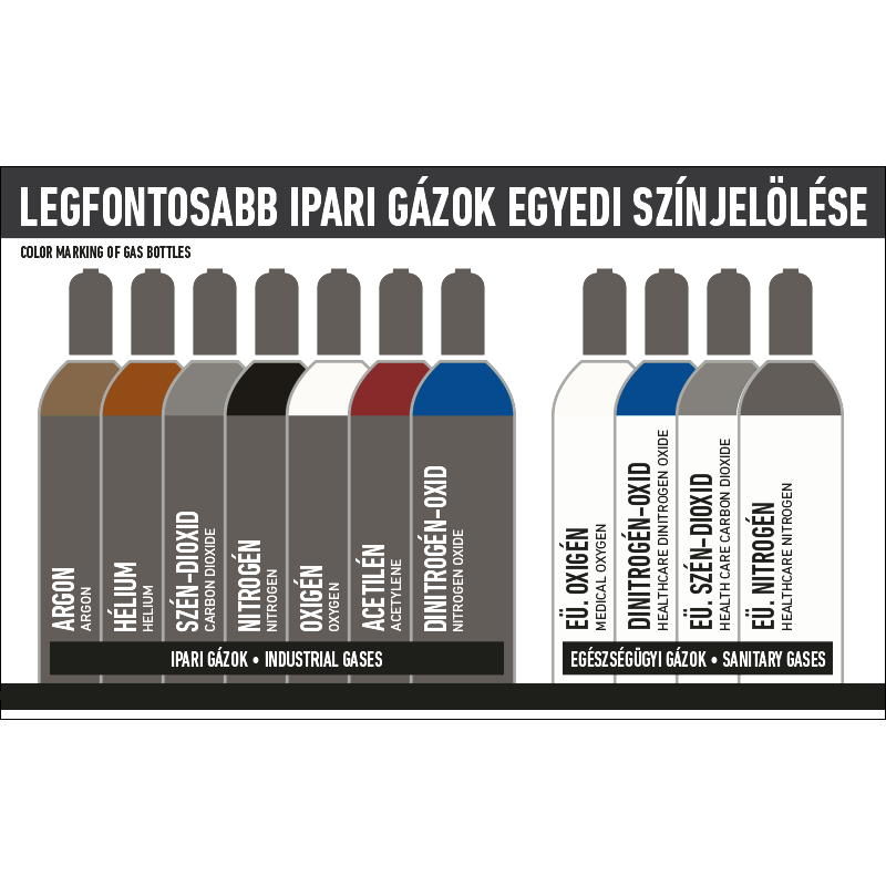 Az ipari és egészségügyi gáz megkülönböztetésére szolgáló szín, illetve a a gáztöltetre jellemző színjelölés a palacktesten jelölendő.