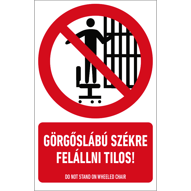 A “Görgőslábú székre felállni tilos!” a guruló görgős székre felállást tiltó piktogram+felirat.