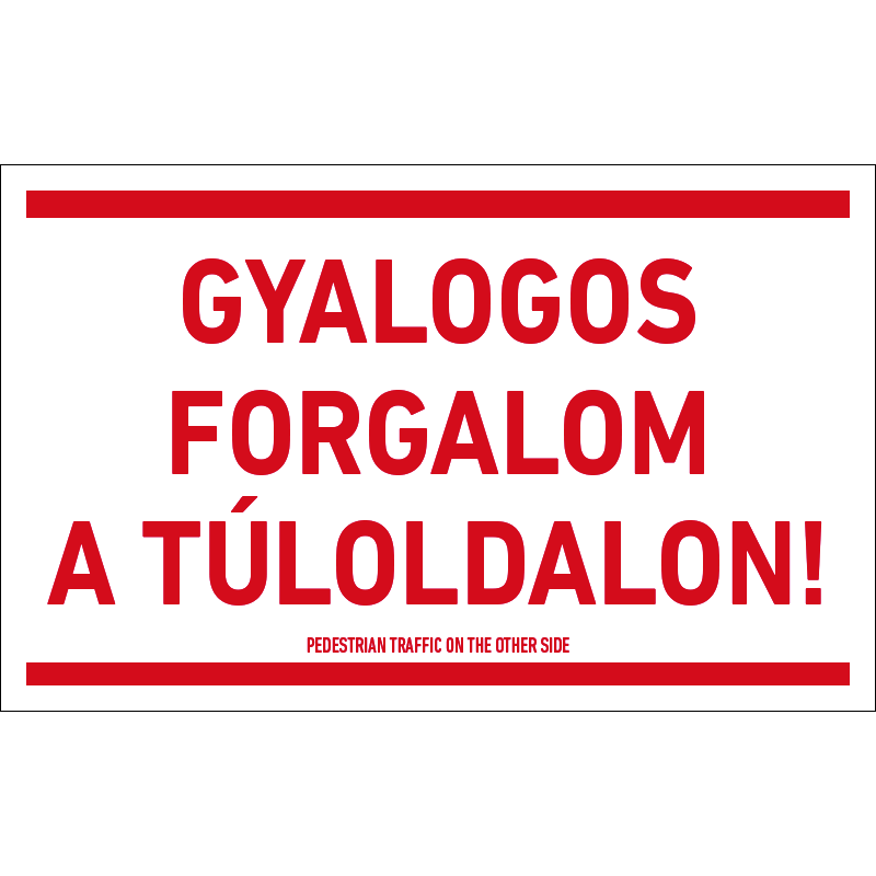 A “Gyalogos forgalom a túloldalon!” a biztonság betartására vonatkozik, a gyalogos közlekedést szabályozó fehér alapon piros felirat.