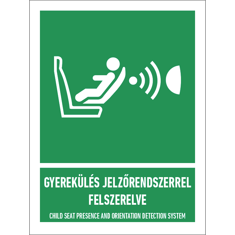 A “Gyerekülés jelzőrendszerrel (CPOD) felszerelve” a CPOD jelzőrendszerre figyelmeztető zöld alapon fehér piktogram.