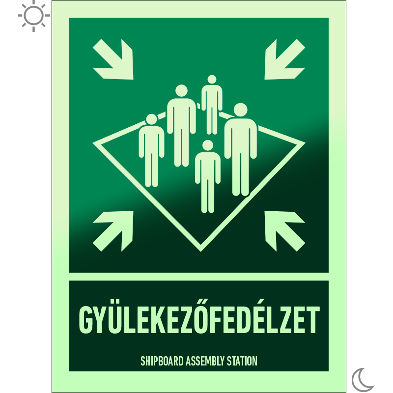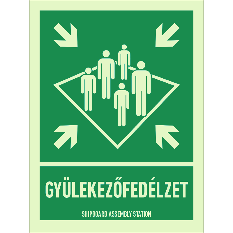 A “Gyülekezőfedélzet” a hajón a biztonságos gyülekezőfedélzetet jelző zöld alapon fehér piktogram.