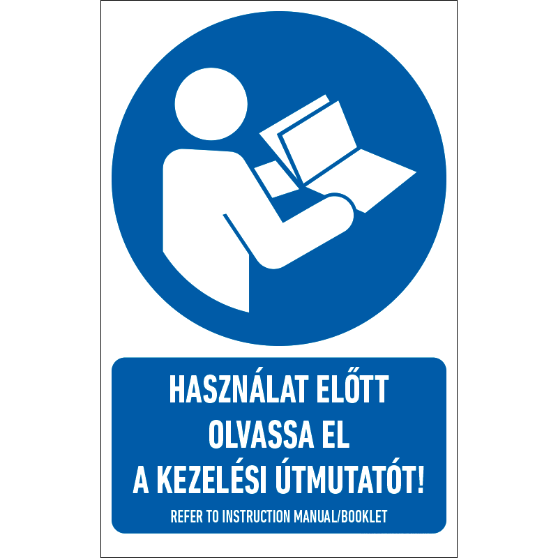 Az “Használat előtt olvassa el a kezelési útmutatót!” a biztonságra és egészség védelmére vonatkozik: a kezelési útmutató használat előtti elolvasására utasító kék alapon fehér piktogram+felirat.
