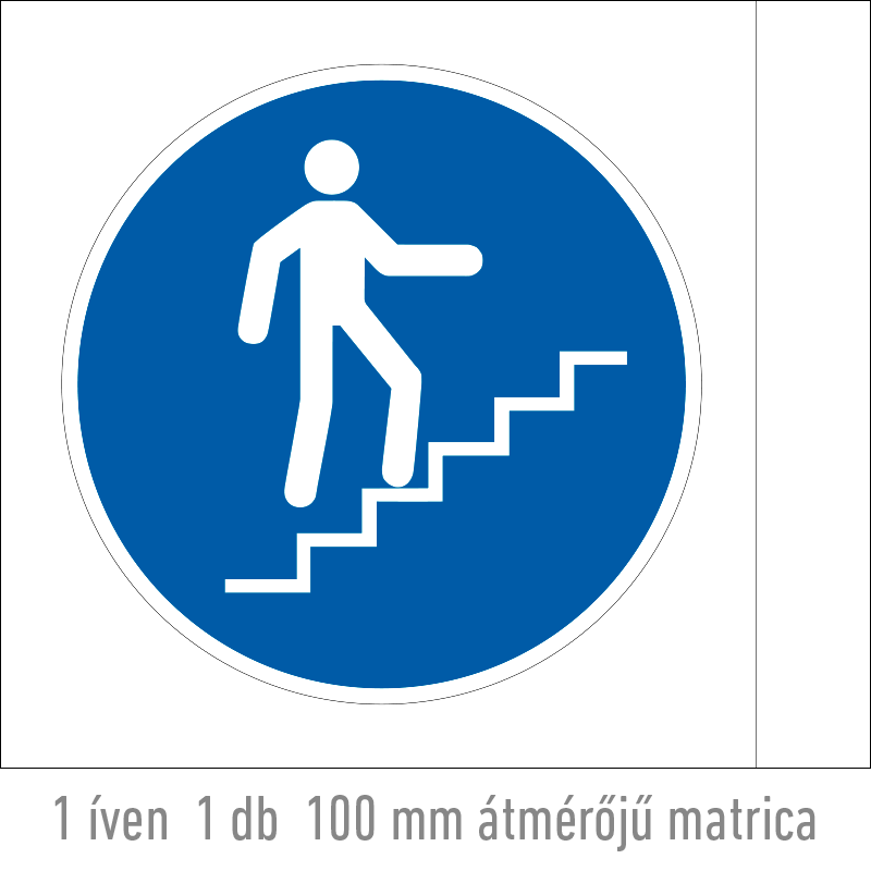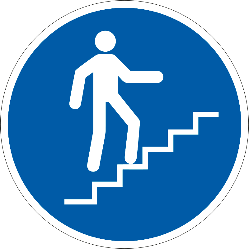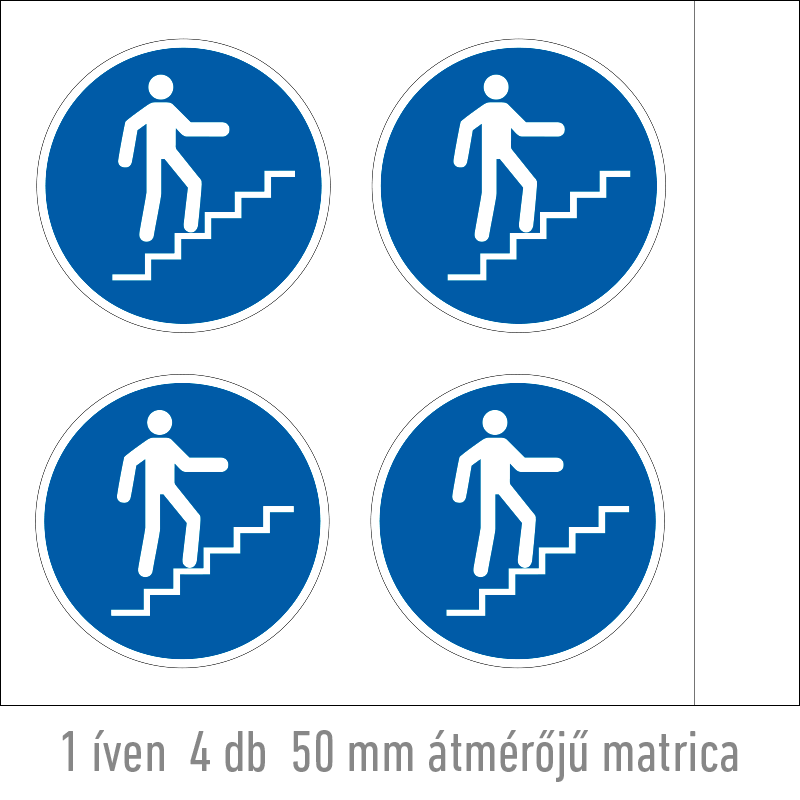 A “Használja a lépcsőt!” a biztonság és egészség védelmére vonatkozik: a lépcső használatát előíró kék alapon fehér piktogram.