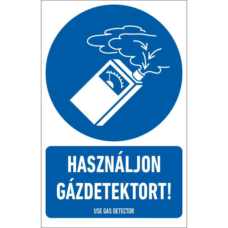 A “Használjon gázdetektort!” a biztonság és egészség védelmére vonatkozik: a gázdetektor használatát előíró kék alapon fehér piktogram+felirat.