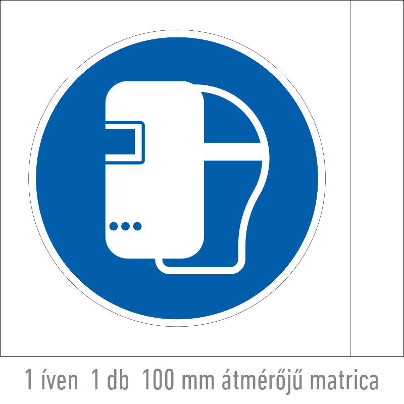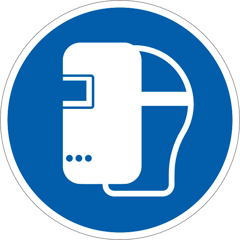 A “Hegesztőpajzs használata kötelező!” a biztonság és egészség védelmére vonatkozik: a hegesztőpajzs használatát előíró kék alapon fehér piktogram.