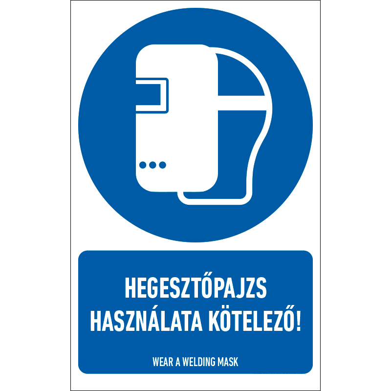 A “Hegesztőpajzs használata kötelező!” a biztonság és egészség védelmére vonatkozik: a hegesztőpajzs használatát előíró kék alapon fehér piktogram+felirat.