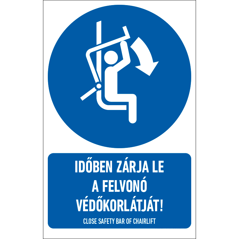 Az “Időben zárja le a felvonó védőkorlátját!” a biztonság és egészség védelmére vonatkozik: a felvonó védőkorlátjának lezárását előíró kék alapon fehér piktogram+felirat.