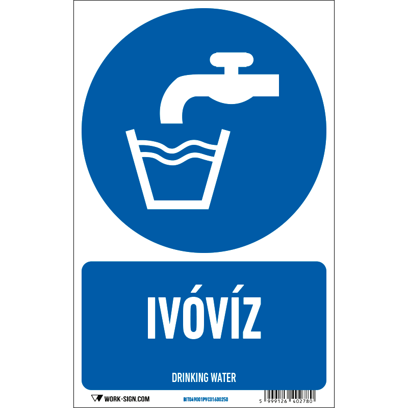 Az “Ivóvíz” a biztonságra és egészség védelmére vonatkozik, emberi fogyasztásra alkalmas, iható vizet jelölő kék alapon fehér piktogram+felirat.