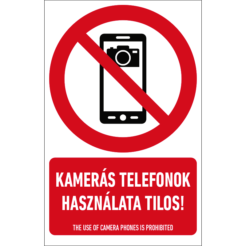 A “Kamerás telefonok használata tilos!” a telefonnal készített felvételek készítését tiltó piktogram+felirat.