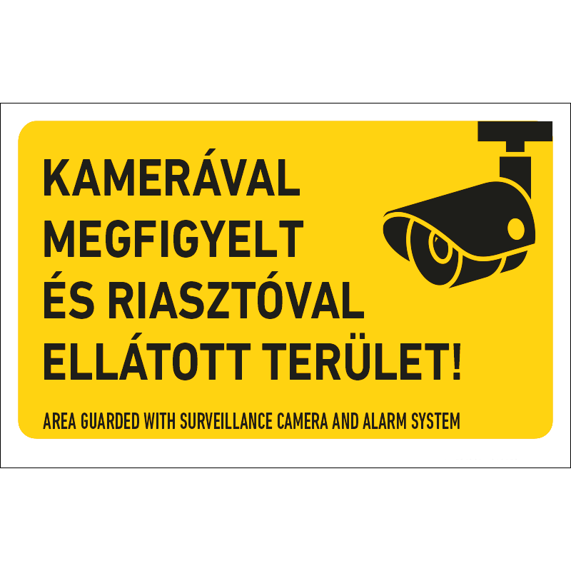 A “Kamerával megfigyelt és riasztóval ellátott terület!” a biztonsági kamerás megfigyelésre és a riasztóra figyelmeztető piktogram+felirat.