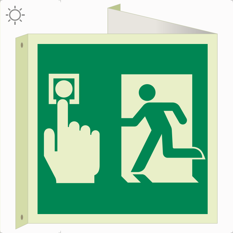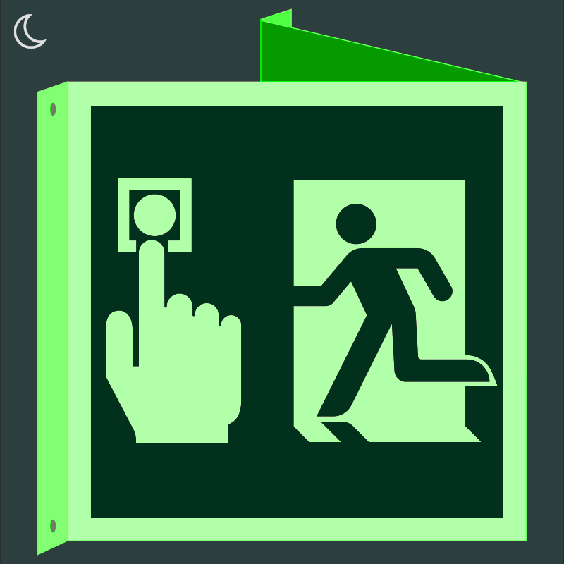 A “Késleltetés nélkül nyitható vészkijárat” a késleltetés nélkül nyitható vészkijárat jelző zöld alapon fehér piktogram.