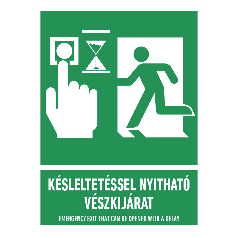 A “Késleltetéssel nyitható vészkijárat” a késleltetéssel nyitható vészkijárat jelző zöld alapon fehér piktogram.