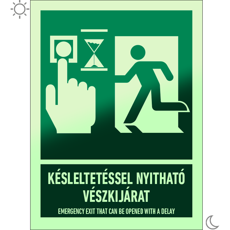 Késleltetéssel nyitható vészkijárat matrica / tábla (piktogram + felirat)