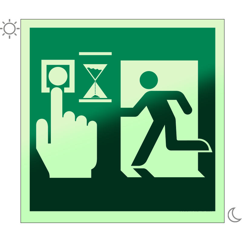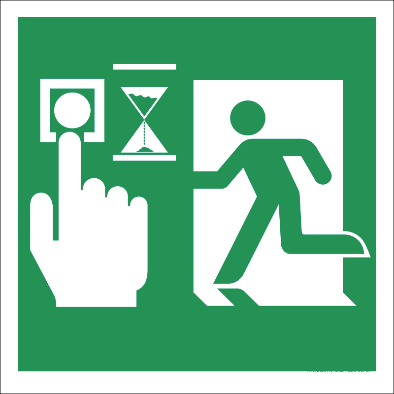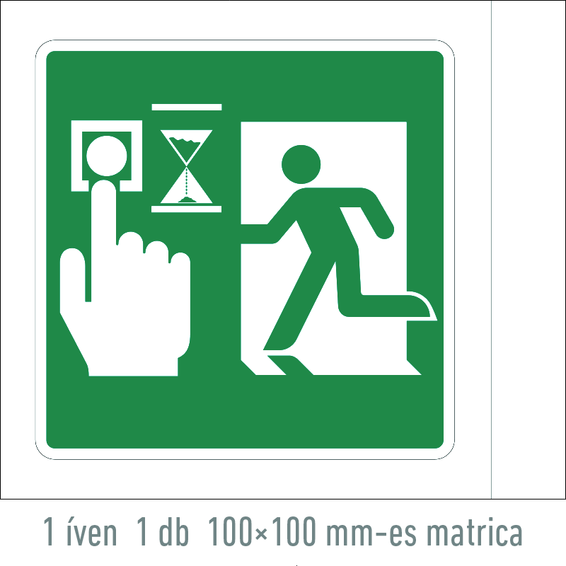 A “Késleltetéssel nyitható vészkijárat” a késleltetéssel nyitható vészkijárat jelző zöld alapon fehér piktogram.
