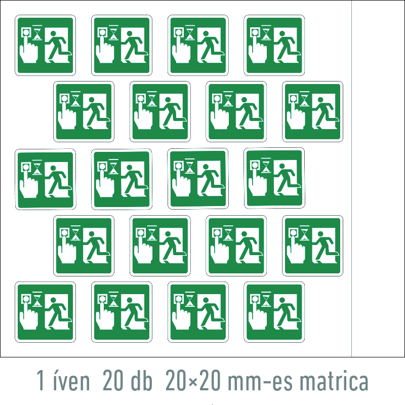 | Késleltetéssel nyitható vészkijárat matrica (piktogram) 20x20 mm MET108001ONV00200020 | vinil öntapadó | 20 mm | 20 mm | 0.2 mm | ív | 330 Ft | 419 Ft |