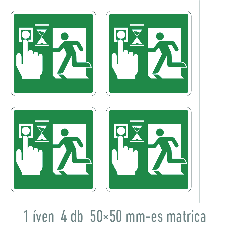 | Késleltetéssel nyitható vészkijárat tábla (piktogram) 150x150 mm MET108001PET01500150 | PET-G 0,7 mm+kétoldalas ragasztó | 150 mm | 150 mm | 1 mm | db | 775 Ft | 984 Ft |