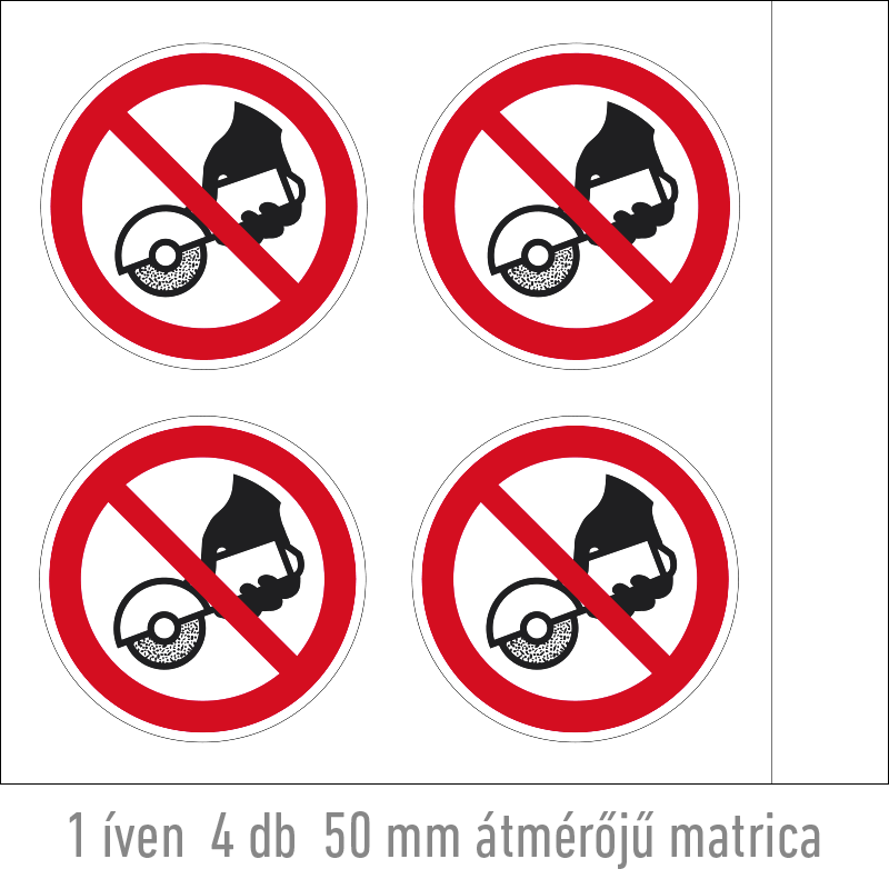 | Kézi sarokcsiszolóval használni tilos! matrica (ISO 7010-P034 piktogram) 50 mm TIT068000ONV00500000 | vinil öntapadó | 50 mm | 50 mm | 0.2 mm | ív | 330 Ft | 419 Ft |