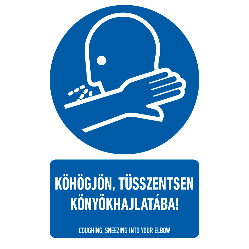 A “Köhögjön, tüsszentsen könyökhajlatába!” a biztonság és egészség védelmére vonatkozik: a fertőzések terjedésére figyelmeztető kék alapon fehér piktogram+felirat.