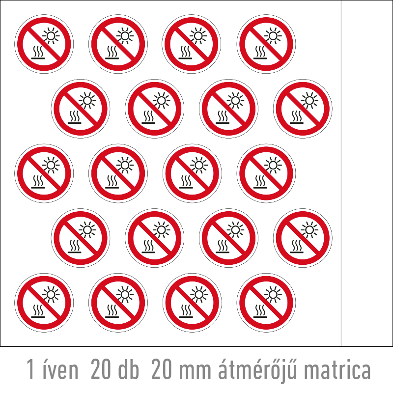 | Közvetlen napfénynek, meleg felület hatásának kitenni tilos! matrica (ISO 7010-P068 piktogram) 20 mm TIT084000ONV00200000 | vinil öntapadó | 20 mm | 20 mm | 0.2 mm | ív | 330 Ft | 419 Ft |