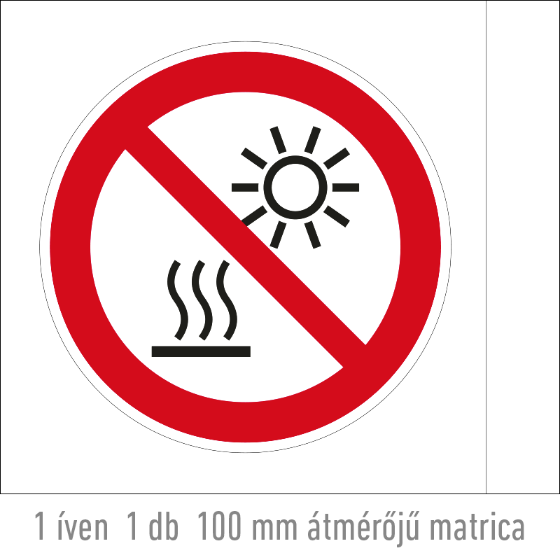 | Közvetlen napfénynek, meleg felület hatásának kitenni tilos! matrica (ISO 7010-P068 piktogram) 100 mm TIT084000ONV01000000 | vinil öntapadó | 100 mm | 100 mm | 0.2 mm | db | 225 Ft | 286 Ft |