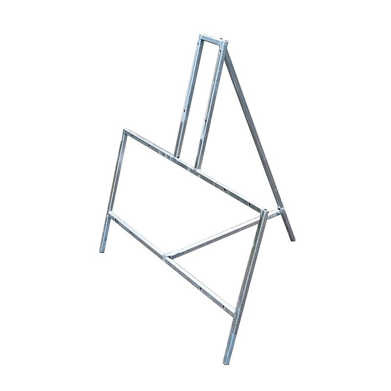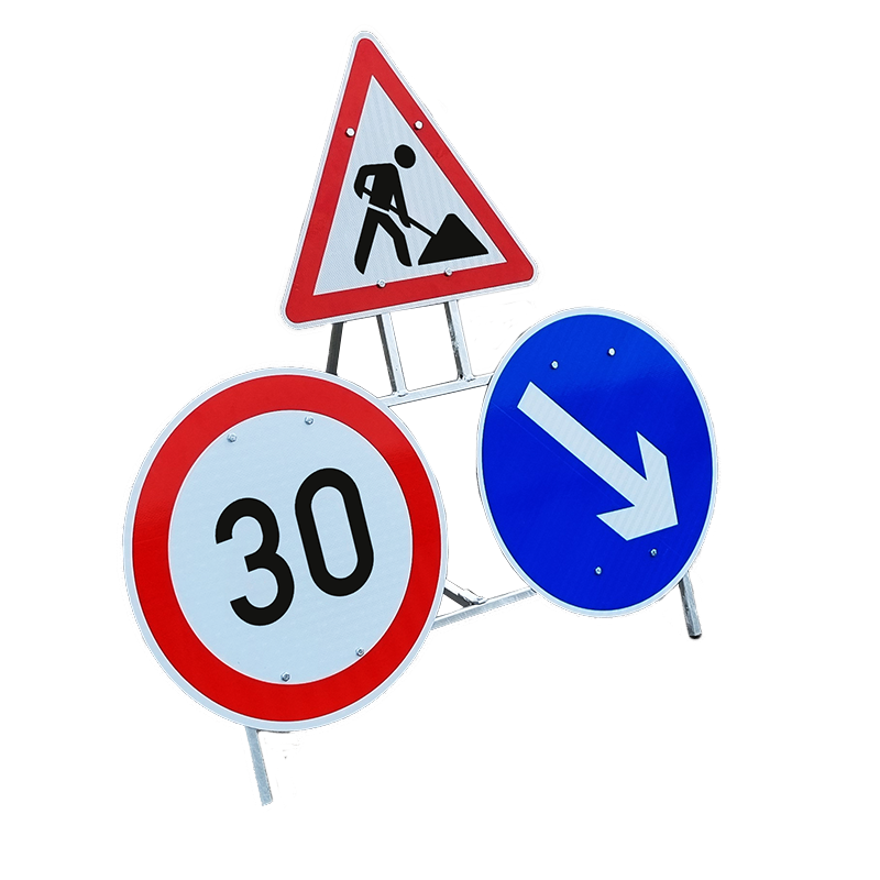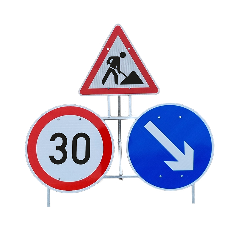 Acél zártszelvényből készült szerkezet, amely közlekedési táblák kihelyezésére szolgál ideiglenes vagy építési területeken.
