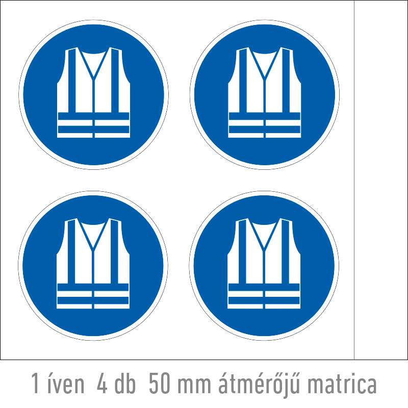 | Láthatósági mellény viselése kötelező! matrica (ISO 7010-M015 piktogram) 50 mm BIT057000ONV00500000 | vinil öntapadó | 50 mm | 50 mm | 0.2 mm | ív | 330 Ft | 419 Ft |