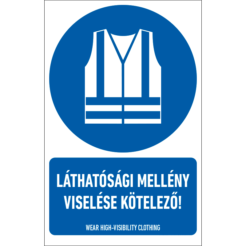 A “Láthatósági mellény viselése kötelező!” a biztonság és egészség védelmére vonatkozik: láthatósági mellény használatát előíró kék alapon fehér piktogram+felirat.