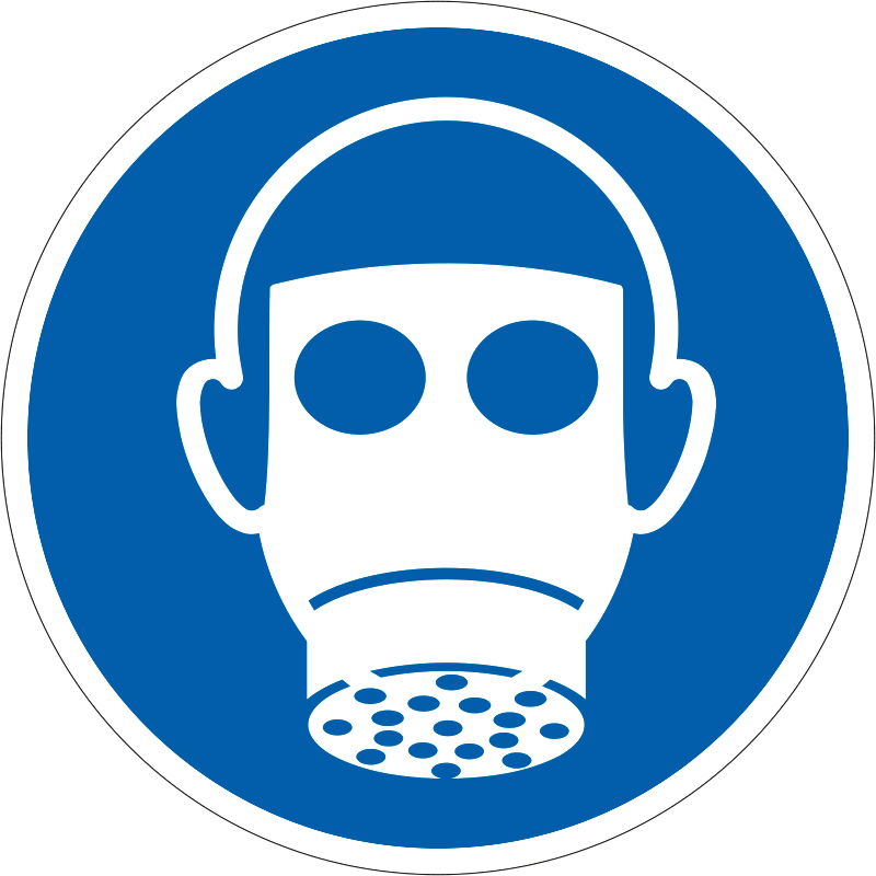 A “Légzésvédő használata kötelező!” az egészség védelmére vonatkozik: munkavédelmi légzésvédő használatát előíró kék alapon fehér piktogram.