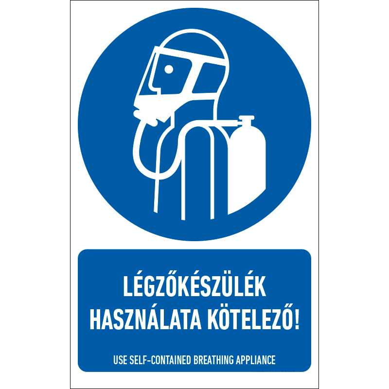 A “Légzőkészülék használata kötelező!” az egészség védelmére vonatkozik: légzőkészülék használatát előíró kék alapon fehér piktogram+felirat.