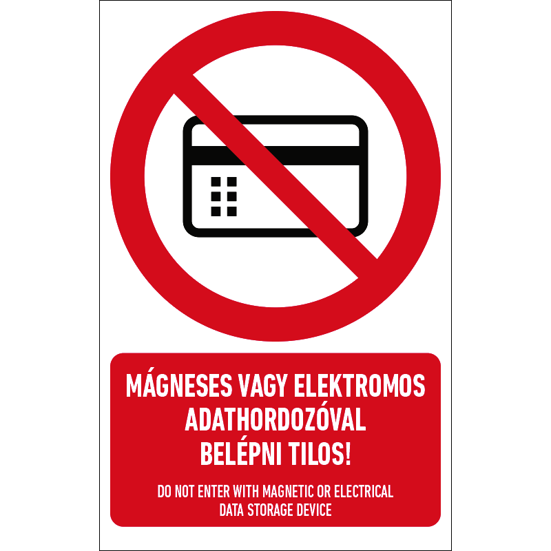 A “Mágneses vagy elektromos adathordozóval belépni tilos!” az elektromágneses térbe mágneses vagy elektromos adathordozó bevitelét tiltó piktogram+!felirat.