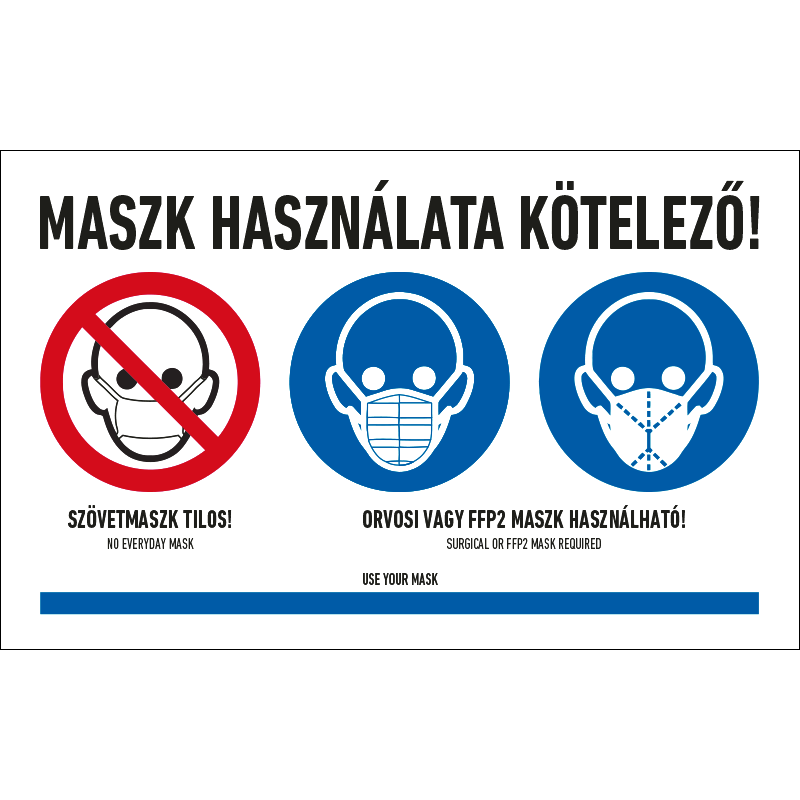 A “Maszk használata kötelező!” a biztonság és egészség védelmére vonatkozik: a maszk használatát előíró piktogram+felirat.