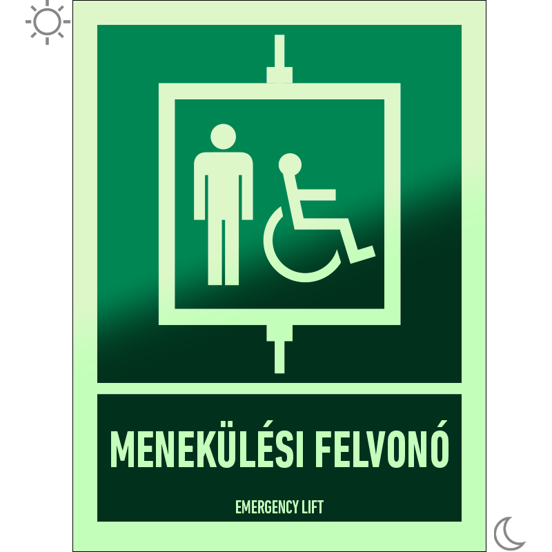 | Menekülési felvonó utánvilágító tábla (piktogram + felirat) 150x200 mm MET047002UTG01500200 | PET-G 0,7 mm+utánvilágító vinil | 150 mm | 200 mm | 1.5 mm | db | 1625 Ft | 2064 Ft |