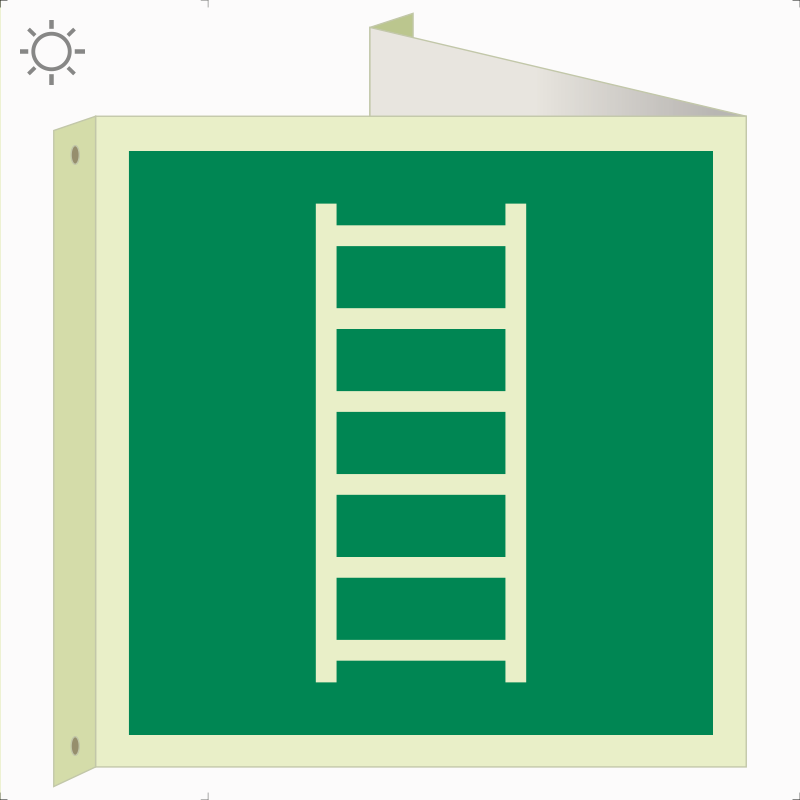 | Menekülési létra utánvilágító tábla, faltól elálló, sátor alakú, kétoldalas (ISO 7010-E059 piktogram) 150x150 mm MET074003UTG01500150 | PET-G 0,7 mm+utánvilágító vinil | 255 mm | 150 mm | 100 mm | db | 3650 Ft | 4636 Ft |