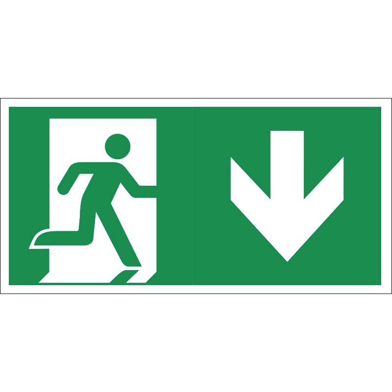A “Menekülési út le” a lefelé vezető menekülési utat jelző zöld alapon fehér piktogram.
